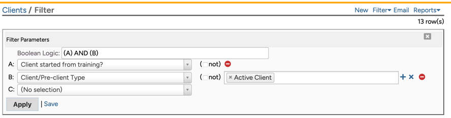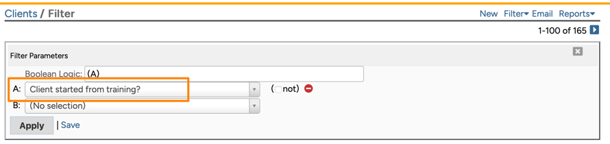 The "Client started from training" Clients filter, on the other hand, actually looks at the history of the client to see if they first participated in training or whether they first received counseling: