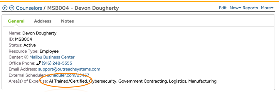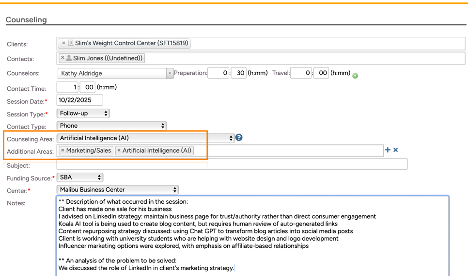 This line item counts the total number of unique clients counseled in the area of "Artificial Intelligence" as specified on the counseling session in either the "Counseling Area" field or the "Additional Areas" field: