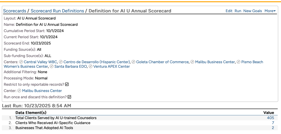 To run the scorecard, simply select Manage|Scorecards and then choose Generate Scorecard. From the "Layout" drop down choose: "AI U Annual Scorecard" and then set the dates, centers and funding sources as appropriate, keeping in mind that in order for a session to be considered for this scorecard it must: