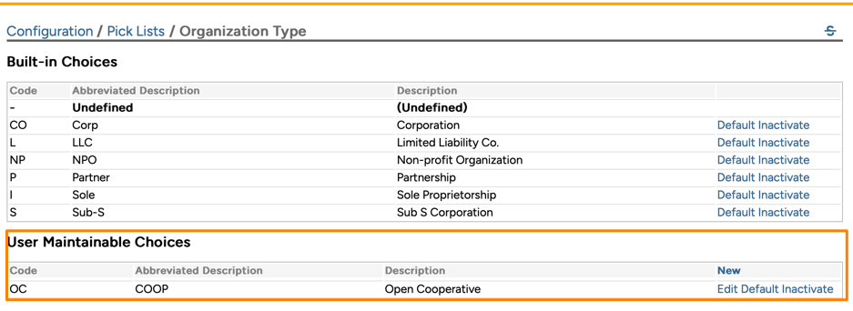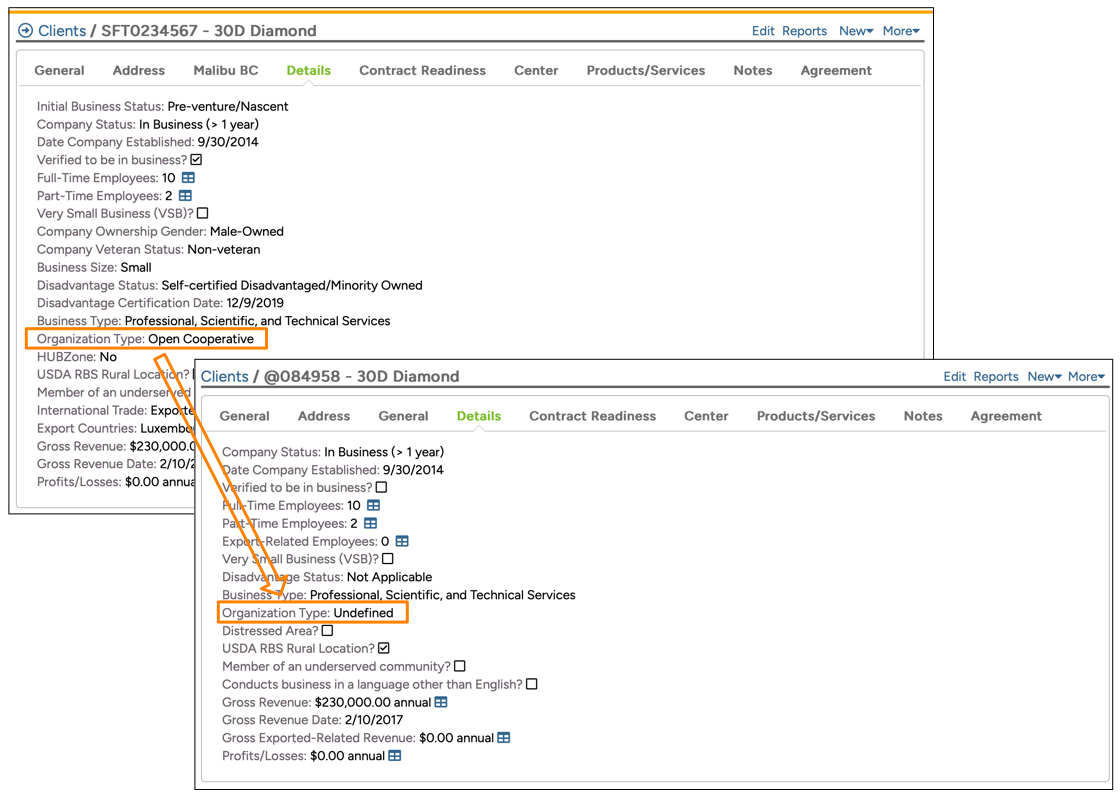 The client record that is exported includes all pertinent system-defined fields, but it will not include user-defined fields. Furthermore, if you have customized drop down selections and added your own drop down choice, then this also will not be transferred. For example, while the "Organization Type" field is a system-defined field, in the example below, you will see that a user-defined option has been added to this drop down field: