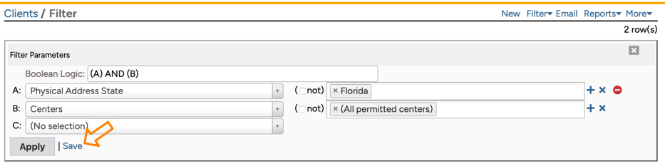 Again, make sure you include all pertinent centers, and verify that the result meets your expectations. Assuming the filter shows all the clients that you want to export, then Save the filter and give the saved filter a name you will recognize later.