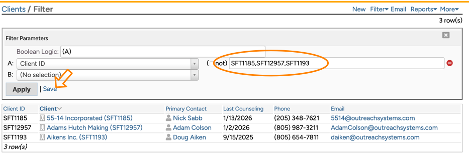 In order to export client records from your database you will need to create a filter that identifies the clients to be exported, and save that filter. Perhaps you are planning on exporting all clients in a particular county or state, then you might create a filter that looks like this: