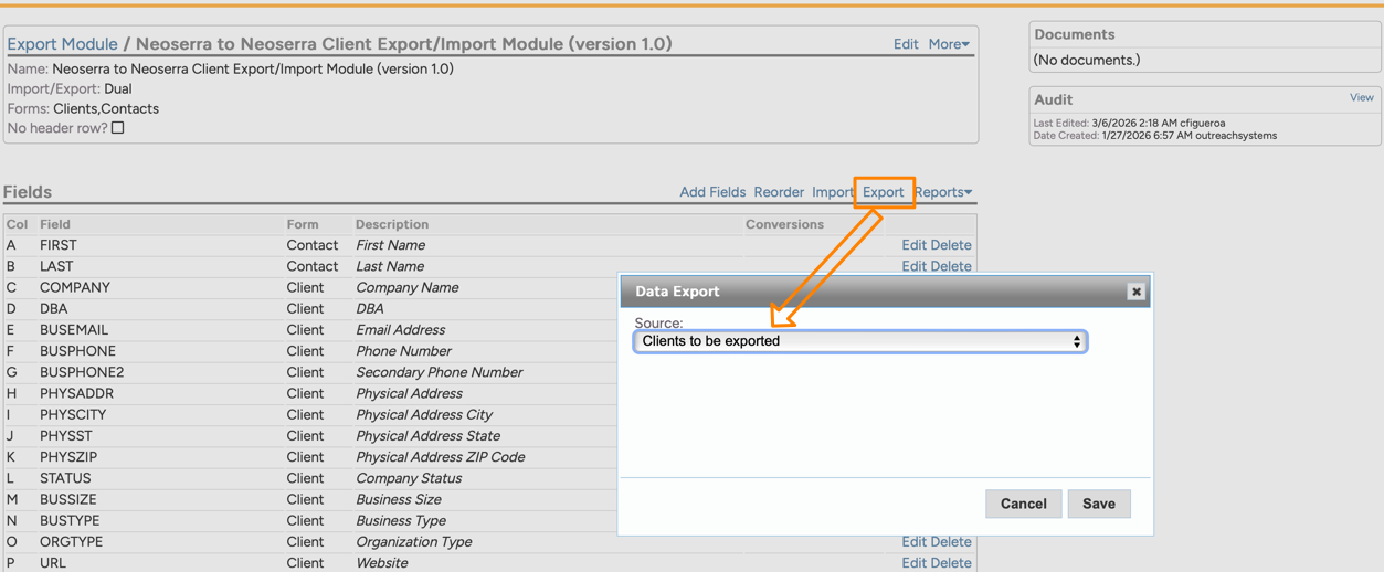 OutreachSystems has created an export definition that allows one Neoserra database administrator to export client record(s) in a format that can then be imported into another Neoserra database. The export definition only includes client data, no sessions, training attendance or survey information is included in the record, nor can the bid match search profile be transferred via this process (although OutreachSystems can assist once the client record has been imported). It should also be noted that this process is not designed to transfer client document attachments. The purpose of the export definition is simply to share clients across different Neoserra databases.