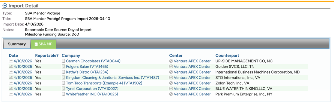 - Import SBA Mentor-Protégé Program (MPP) milestones?: By checking this option, OutreachSystems can create a SBA Mentor-Protégé Program (MPP) Agreement milestone when there is a match between the UEI number in the SBA spreadsheet and the UEI number in the system-defined fields on the Neoserra client records. OutreachSystems is not responsible for any errors in the data provided by SBA, nor can OutreachSystems eliminate potential duplicate milestone that may already exist in your database. The milestone date will be set based upon the "Reportabe Date Source" referenced above. Since SBA updates the spreadsheet around the 6th or 7th day each month, OutreachSystems processes the file on the 10th of each month to ensure we always receive the most up to date file, and the results will be posted in a separate batch from the awards records. It should be noted that the SBA MPP milestones will always be imported as reportable records.